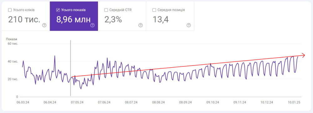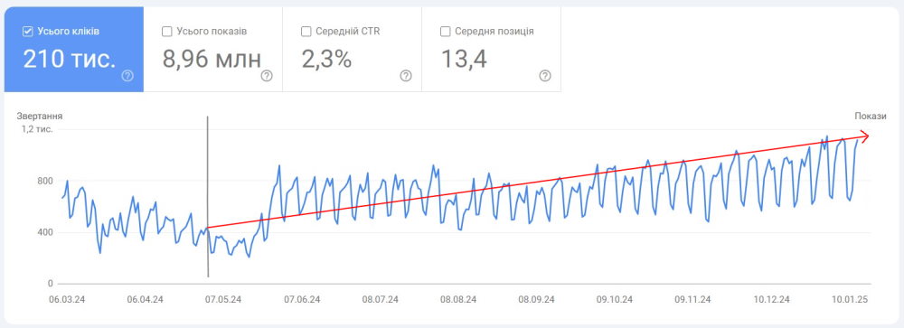 Разом із зростанням позицій покращилися й інші ключові метрики. Органічний трафік стабільно зростав, що підтверджували графіки в Google Search Console. Загалом сайт отримав 210 тисяч кліків та майже 9 мільйонів показів, а середня позиція покращилася до 13,4. Це значно розширило охоплення та підвищило впізнаваність клініки серед користувачів, які шукали медичні послуги в Києві.