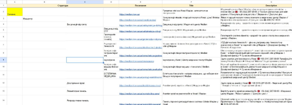 Наступним кроком стало формування нового семантичного ядра. Ми зібрали детальні запити по всіх напрямках медичних послуг, включно з вузькопрофільними та низькочастотними запитами, які могли привести цільових користувачів. Особливу увагу приділили комерційним запитам, здатним безпосередньо впливати на конверсії та кількість записів до лікарів.
