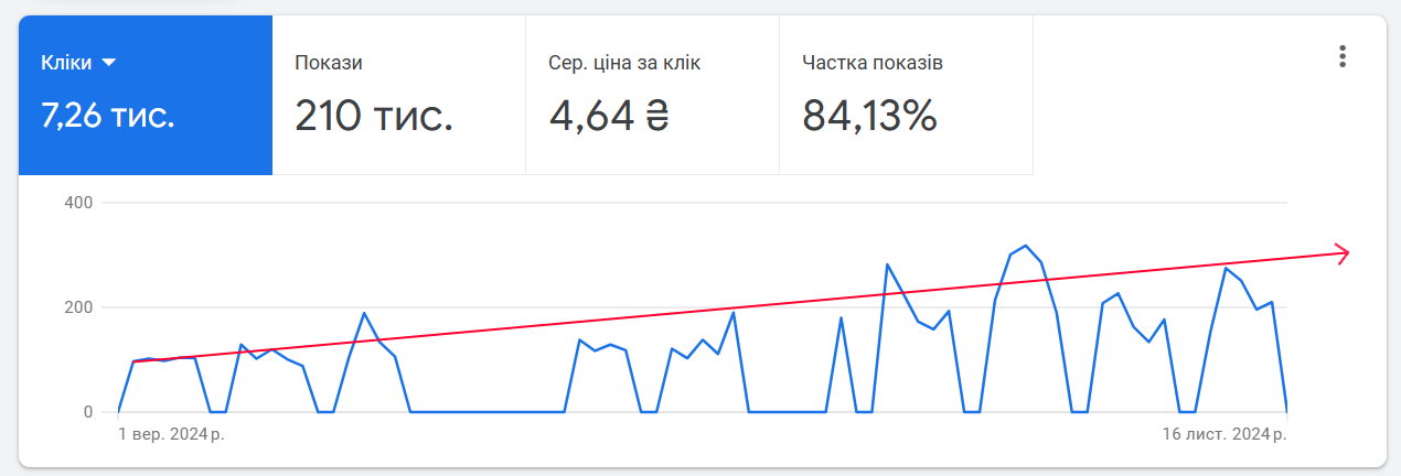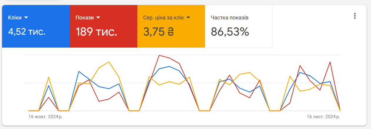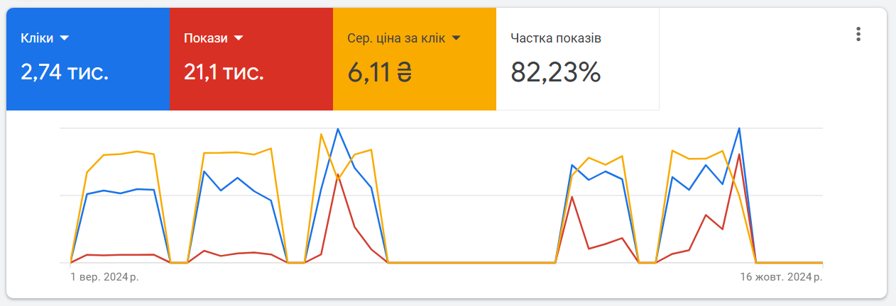 Працюють пошукові кампанії та ремаркетинг, орієнтуючись на максимально релевантні запити, що дозволяє утримувати вартість кліка на прийнятному рівні. На скріншоті нижче відображено загальну динаміку кампаній за місяць після початку робіт: видно рівні показники кліків, показів та вартості за клік. Вартість за клік при цьому знижується, а кількість кліків збільшується. Характерною рисою для цього бізнесу є чітка сезонність та спад активності у вихідні дні — саме тоді фіксуються просадки у графіку, адже компанію клієнта не працює у вихідні, і ми коригуємо ставки та бюджети відповідно до графіка роботи клієнта.