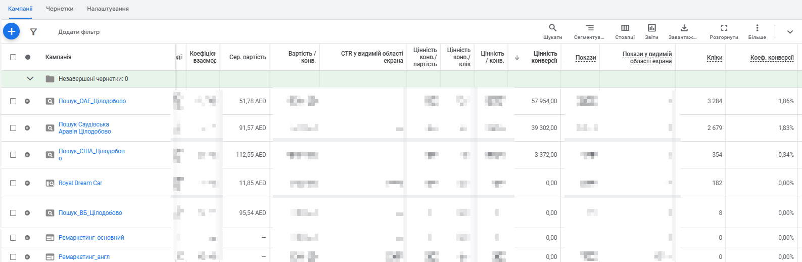 Першим етапом роботи став детальний аудит усіх рекламних кампаній Royal Dream. Ми проаналізували налаштування, креативи, цільові аудиторії та ефективність кожного рекламного каналу. Це дозволило виявити, які інструменти спрацьовують, а які лише «з’їдають» бюджет без результату. Паралельно ми провели глибокий аналіз конкурентного середовища, щоб зрозуміти, як діють інші преміальні сервіси каршерінгу в Дубаї, які канали використовують для залучення клієнтів та які унікальні пропозиції формують на ринку.