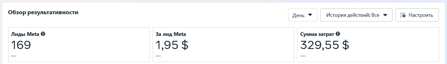 Паралельно ми запустили просування акційних комплектів відеоспостереження для бізнесу та домівок. У результаті кампанія згенерувала 169 лідів із середньою вартістю $1,95 за контакт, що є відмінним показником для нішевого ринку систем безпеки в Казахстані. Такі результати підтвердили ефективність обраної стратегії таргетингу та привабливість комерційної пропозиції.