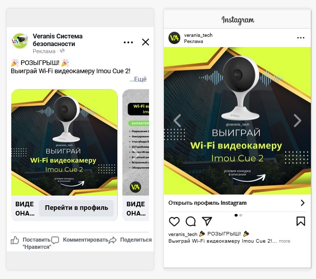 Далі розробили стратегію таргетованої реклами, визначили ключові продукти для просування та підготували креативи для різних форматів — від стрічки новин до Stories і Reels. Особливу увагу приділили створенню візуалу, який би одразу привертав увагу користувачів та чітко транслював вигідні пропозиції та умови розіграшу камери Imou Cue 2.